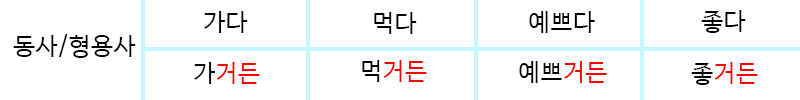 2.Sau ‘거든’ chủ yếu đi với các đuôi câu mệnh lệnh ‘(으)십시오,(으)세요’, đề nghị ‘(으)ㅂ시다, (으)ㄹ까요?’, và thể hiện ý chí ‘겠, (으)ㄹ게요’